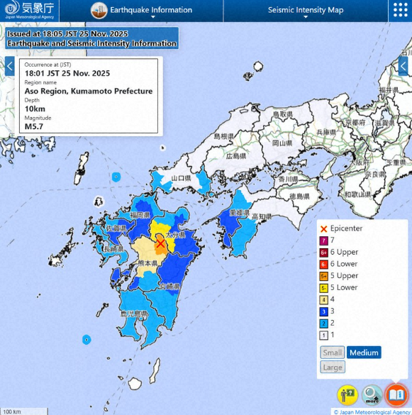 Um terremoto com magnitude preliminar de 5.8 atingiu as províncias de Kumamoto e Oita, na região de Kyushu (sudoeste do Japão), nesta terça-feira (25 de novembro), pouco depois das 18h.