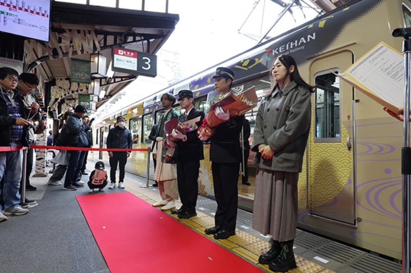 A cerimônia de lançamento ocorreu na Estação Demachiyanagi, no distrito de Sakyo, onde o mestre da estação e o condutor foram homenageados com buquês entregues por estudantes de artes de universidades locais, simbolizando o forte vínculo da linha com a comunidade acadêmica e cultural da região.