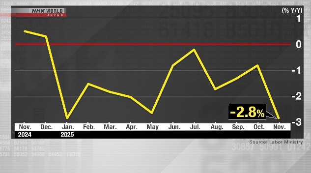 O poder de compra das famílias japonesas continua sob forte pressão, conforme revelam os dados preliminares de novembro divulgados pelo Ministério da Saúde, Trabalho e Bem-Estar Social nesta quinta-feira (08). Os salários reais, que são ajustados pela inflação, registraram uma queda de 2,8% em relação ao ano anterior. Este é o 11º mês consecutivo de declínio, marcando a retração mais acentuada desde janeiro passado e evidenciando que os aumentos de preços continuam a superar o crescimento da remuneração dos trabalhadores.