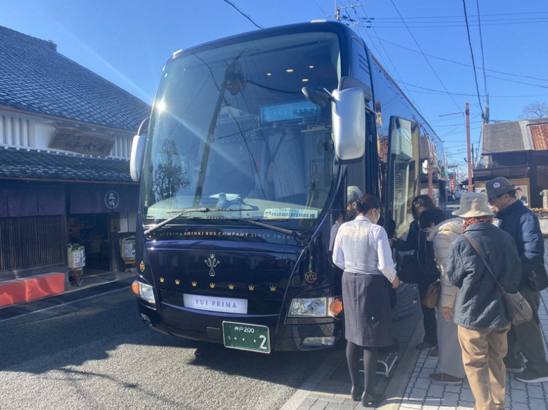 Um passeio turístico seguindo o itinerário proposto pelo Banco Minato, utilizando o luxuoso ônibus da Shinki Bus Co. para transporte, é visto em Tambasasayama, província de Hyogo, em 19 de dezembro de 2025. (Imagem via Mainichi)
