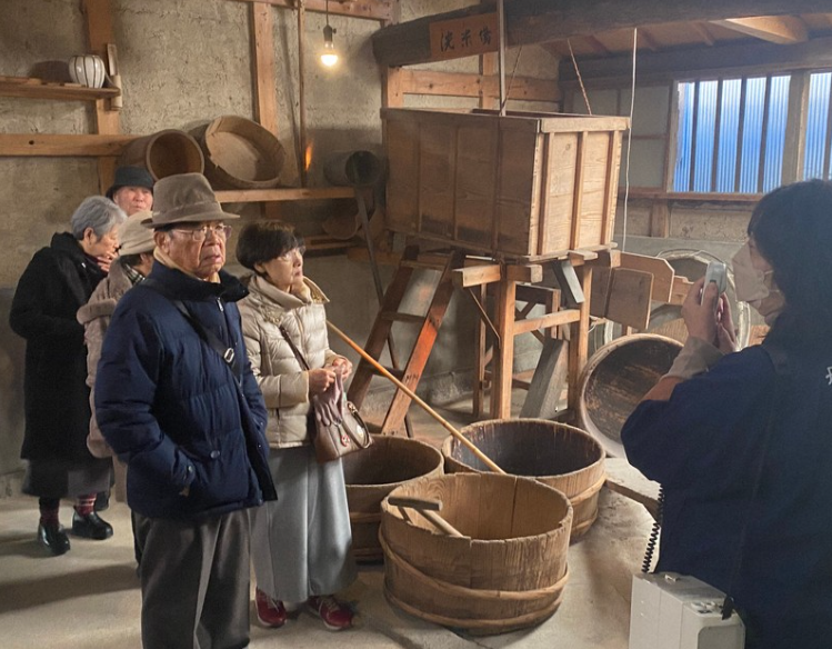 O passeio inclui visitas a uma fábrica de saquê local e a uma loja de produtos especiais, como visto em Tambasasayama, província de Hyogo, em 19 de dezembro de 2025. (Imagem via Mainichi)